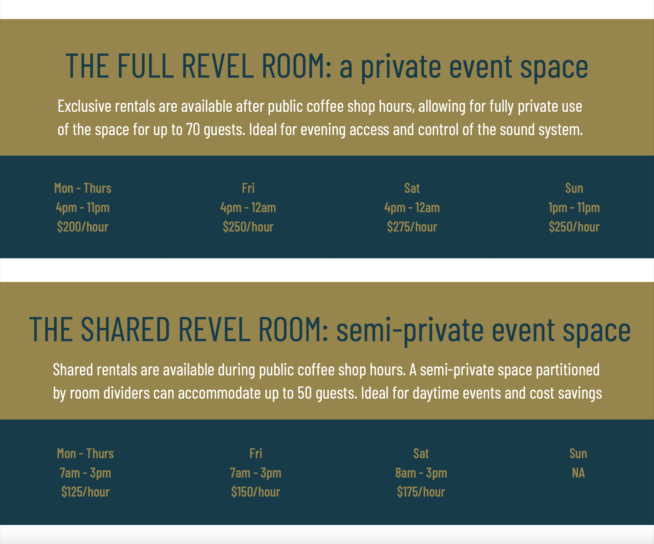 THE event space set up with tables and chairs arranged as they are during coffee shop hours